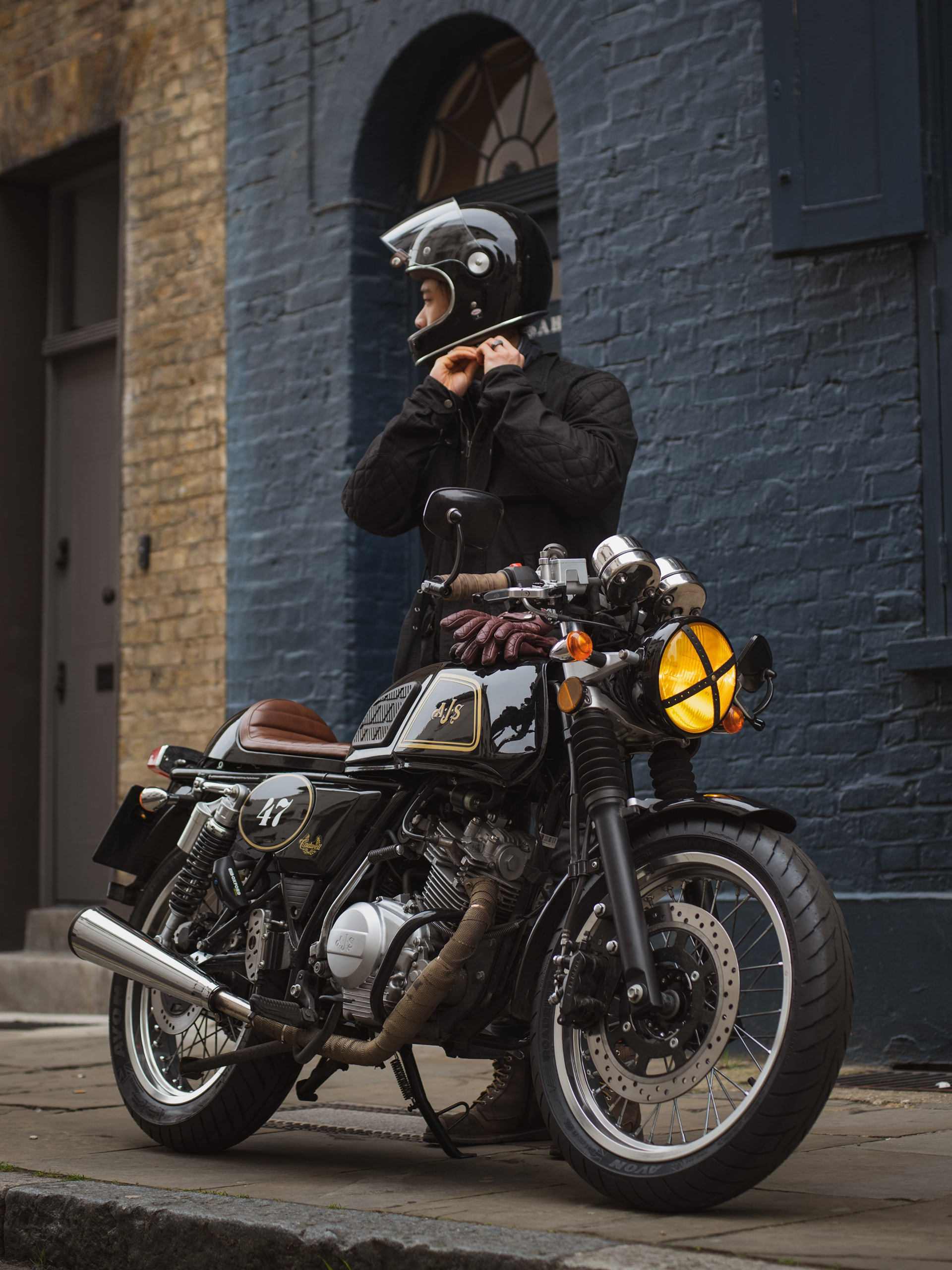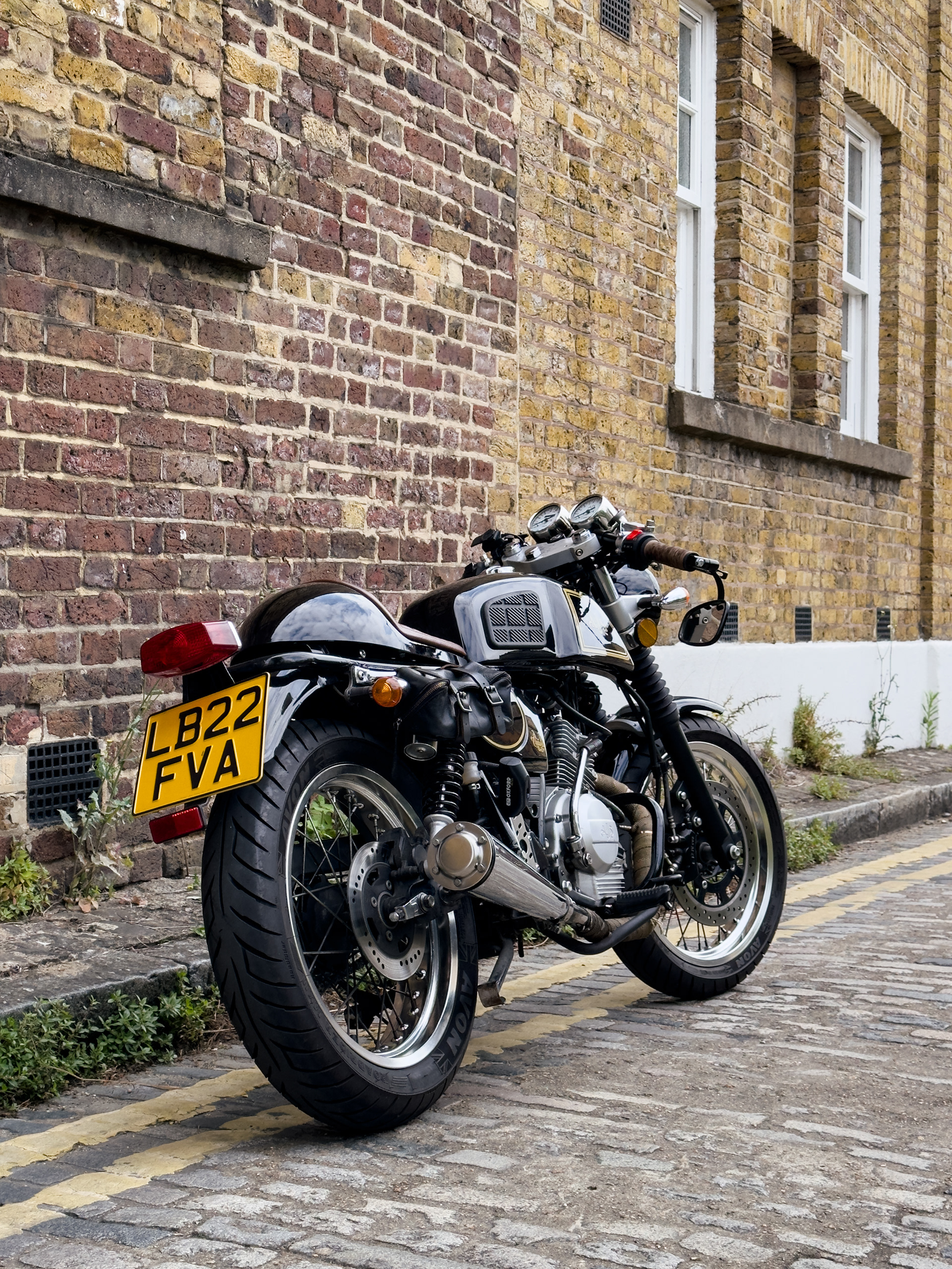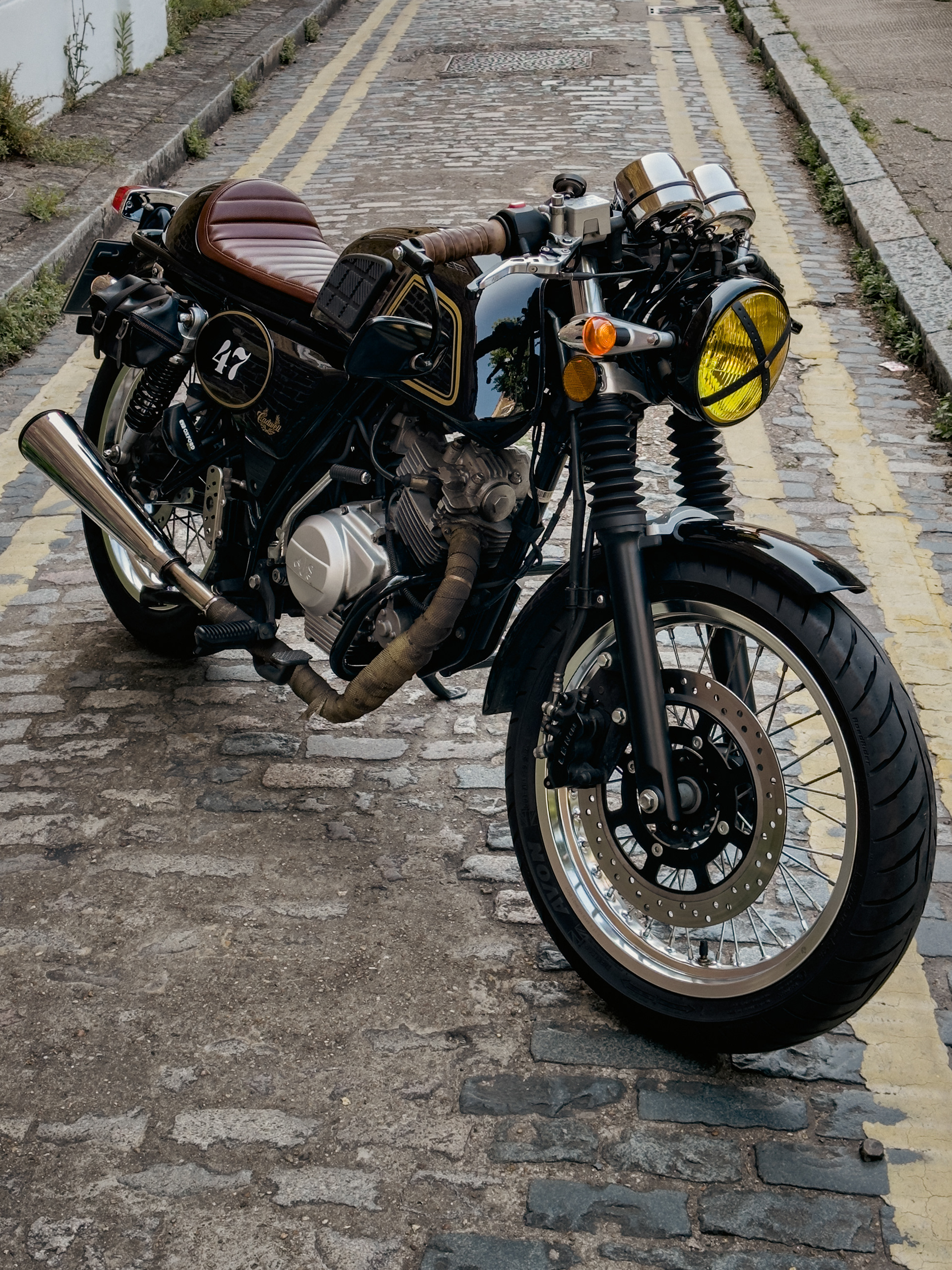 Over time, I wanted to make the bike more 'me'. Keeping the classic cafe racers of old as inspiration, the Workhorse kept the black paint with golden accents, added a touch of brown with the custom seat and leather handlebar wrapped grips, dropped clip-on bars for a truer cafe racer stance, black headlamp with yellow lens, leather headlight 'x', wrapped exhaust pipe, pressed number plate, adjustable bar-end mirrors, side number panel, and Avon Roadrider Mk2 tyres (which made a huge improvement in dry and wet road conditions compared to the stock Kenda tyres). The Workhorse would be the inspiration for the subsequent bikes I later owned.