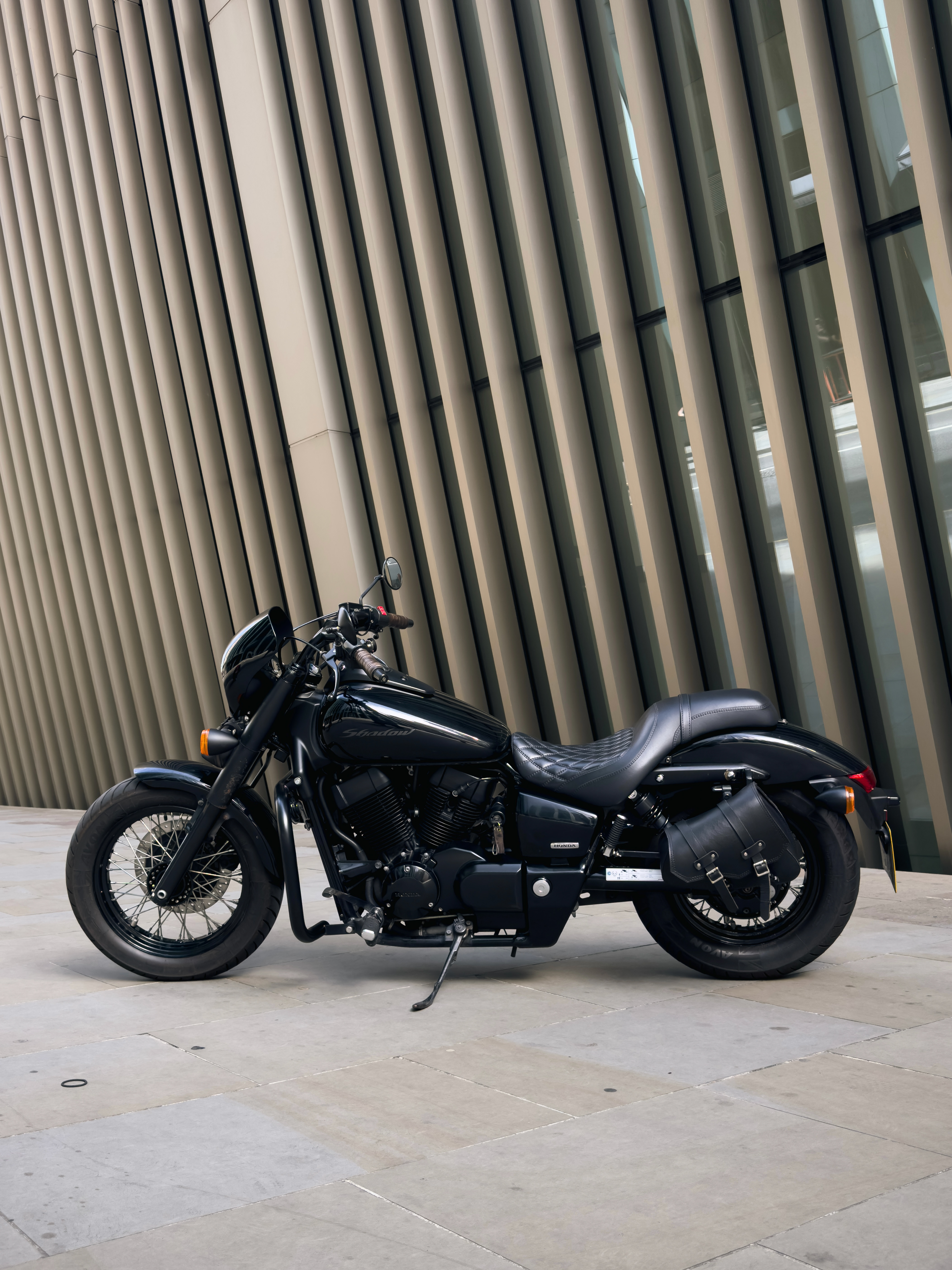 The first job was to give the Shadow a full service, the standard oil and filter change, spark plugs and brake pads - a huge improvement and just the beginning. Keeping the Shadow as close to standard as possible was key, whilst making subtle yet noticeable changes. "Raw, yet refined" was the description I gave the Shadow, which I nicknamed 'Black Horse'. Over time, the stock seat was replaced by Tom Hurley's custom-made cross-stitched cover with medical padding to add texture and comfort, the loud, obnoxious straight pipes changed to a chrome barrel pipes from a 2009 Shadow with a MAF sensor delete (quieter, smoother at lower RPMs, roared at the high revs), headlight cowl cover, signature headlight leather 'X' and handlebar grips just like on my old Cadwell, blacked out all the grey accents, custom bracket for the leather side bag, pressed license plate, and Avon Roadrider 2 tyres with tubeless conversion (some may disagree, however, I absolutely recommend coverting to tubeless even on spoke wheels. It saved me twice from punctures).